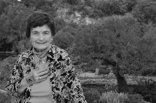 | Former Mayor Lila Cockrell at her beloved Japanese Tea Garden in Brackenridge Park. She's sporting a temporary tattoo for the Power of Preservation. |